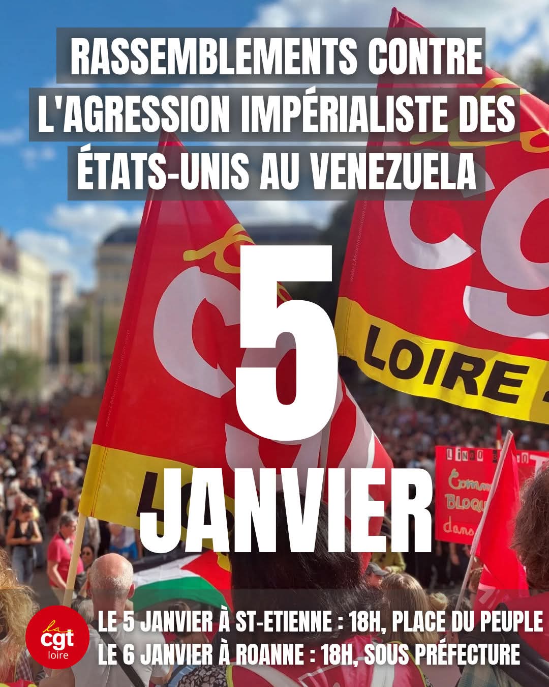 Rassemblements pour dénoncer l’attaque des Etats Unis contre le Vénézuéla Saint-Étienne : lundi 5 janvier à 18h00 place du Peuple (à l’appel d’un très grand nombre d’organisations syndicales, politiques et associatives) Roanne : mardi 6 janvier à 18h00 devant la sous Préfecture Communiqué confédéral en PJ